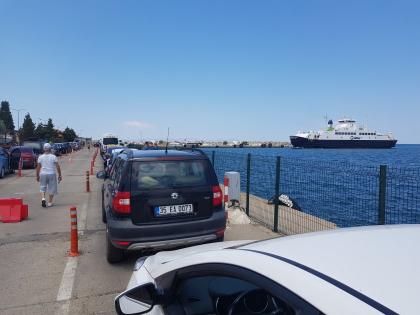 10:30’a doğru Kabatepe de kuyruğa giriyoruz. Kuyruk ama dışarıya taşmış bir kuyruk. Kacta varacagimizi bilmediğimizden online bilet almadık ve hata ettik. Gidiş geliş yol, feribot boşalırken online cıların sollamadı nedeni ile kriz yaşayınca jandarma olaya el koydu. Araçları teker teker ara yolda sıraya soktular. Bu arada biz hiç olmazsa 13 e online bilet alma telâşındayız. Daha 11 feribotu kalkmadan biletle içeri girmeye kalkışınca da arada bir yerlerde kuyruk yarattık. Kuyruk oldu, çünkü bizim kafada bir sürü insan var doğal olarak. Biletsizlerin kuyruğu var ama biletlileri henüz içeri almayınca arafta kaldık.