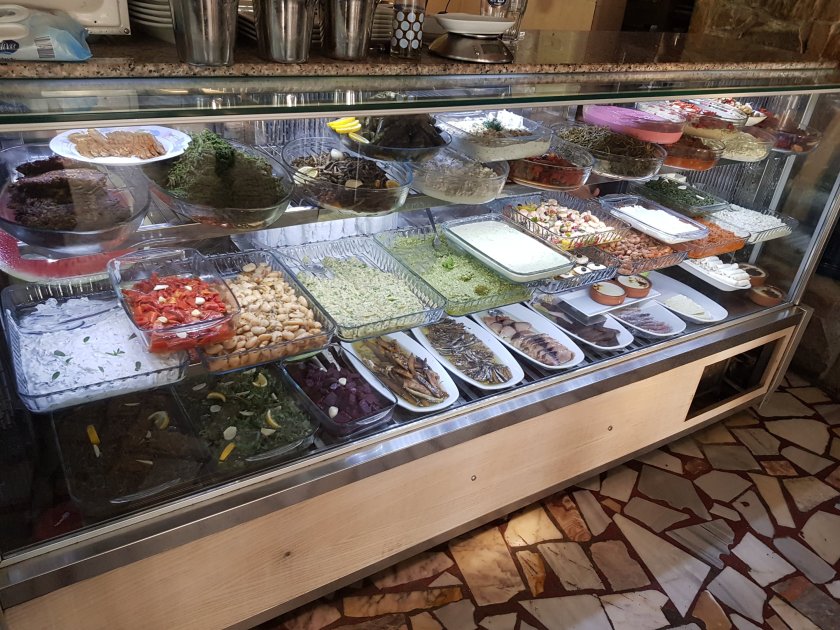 Akşam otelin restoraninda Istanbul da olmayan, daha once tattigimiz değişik mezeler ile yemeğe başlıyoruz. Cevizli yogurtlu kabak, feslegenli girit ezme ve benim favorim balik pastirmasi. Gecen sene daha fazla cesit vardi, bu sene sadece mavi orkinis ve kopek balığından var.